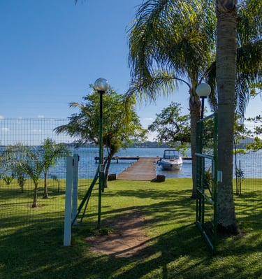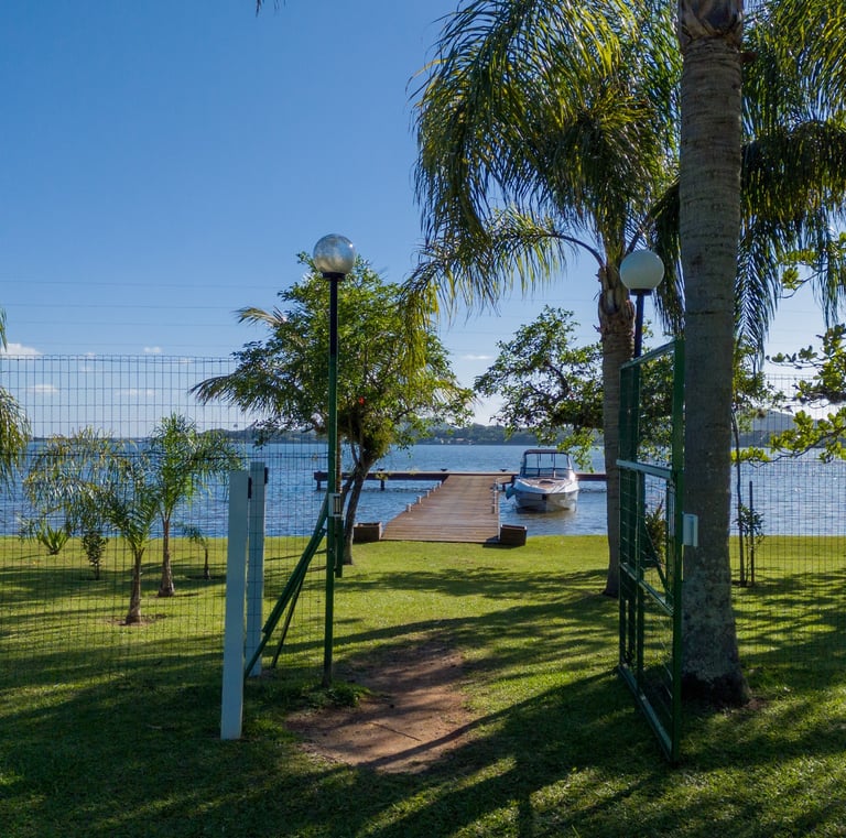 Poucas casas no condomínio oferecem acesso direto à lagoa com gramado aberto e integração total com a natureza.