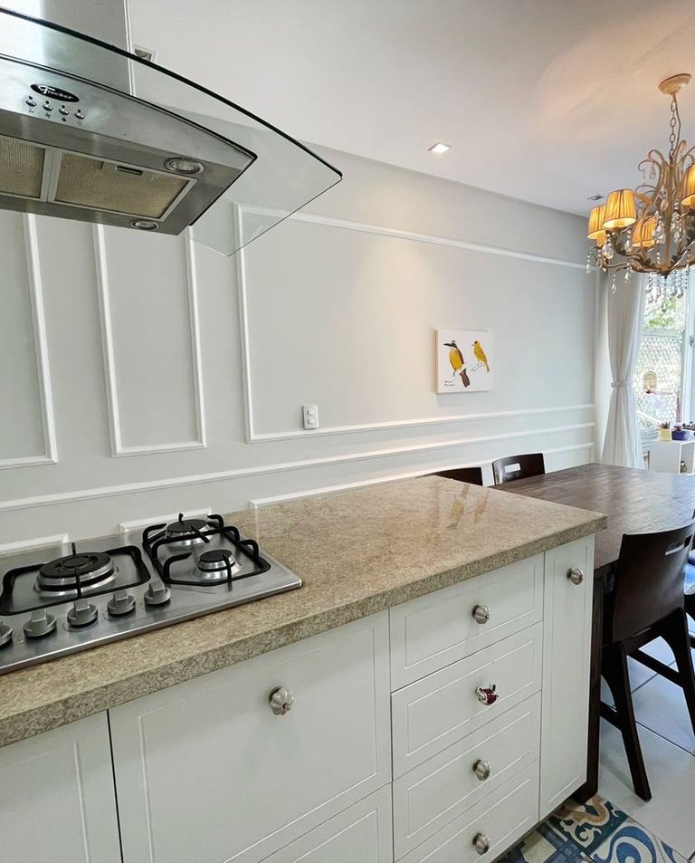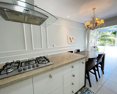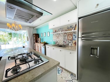 Cozinha, sala e churrasqueira conectadas em um único espaço, ideal para convivência e uso no dia a dia, com fluidez entre interior e exterior.